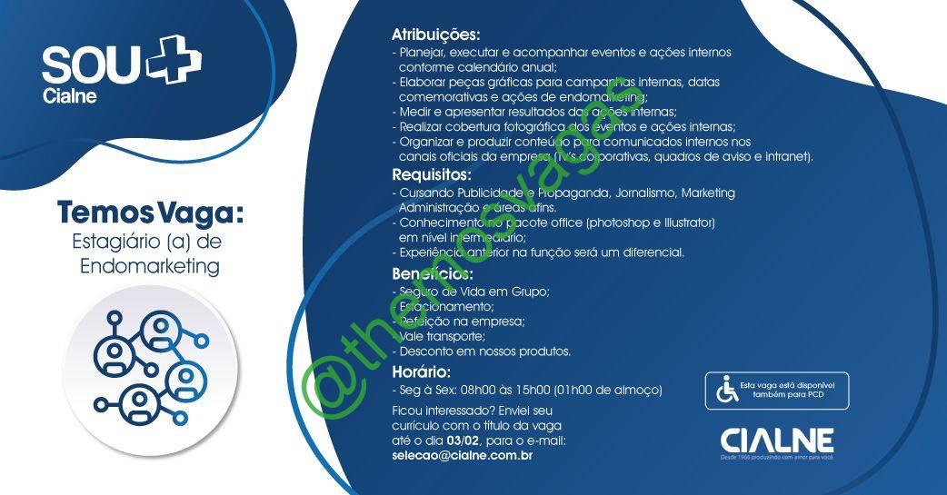 – Interessados(as) e que atendam ao perfil solicitado acima, devem enviar o currículo até 03/02 para o e-mail selecao@cialne.com.br contendo no título/assunto “Estágio em Endomarketing – THE“.