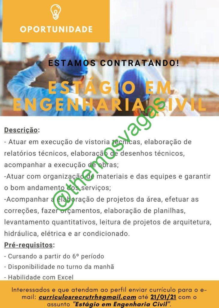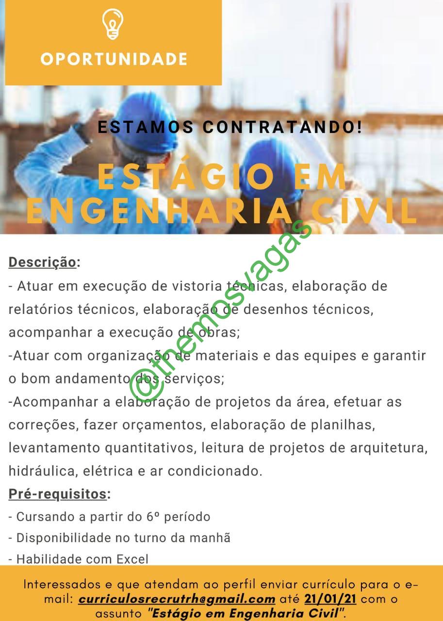 – Interessados(as) e que atendam ao perfil solicitado acima, devem enviar o currículo até /01/2021 para o e-mail curriculosrecrutrh@gmail.com contendo no título/assunto “Estágio em Engenharia Civil THE
