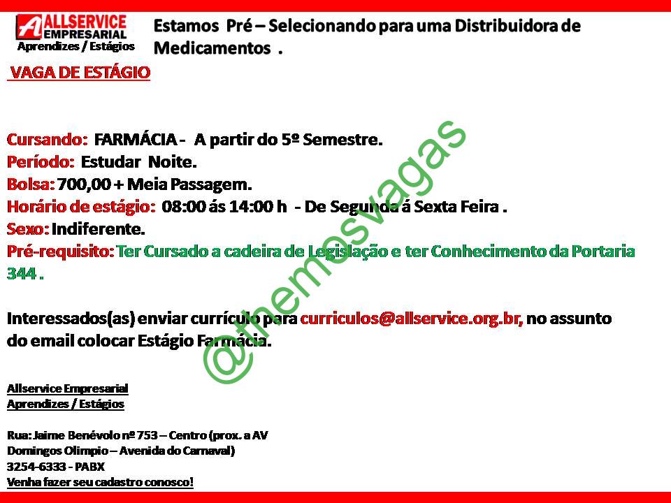 – Interessados(as) e que atendam ao perfil solicitado acima, devem enviar o currículo para o e-mail curriculos@allservice.org.br , contendo no título/assunto “Estágio em Farmácia – FOR”.