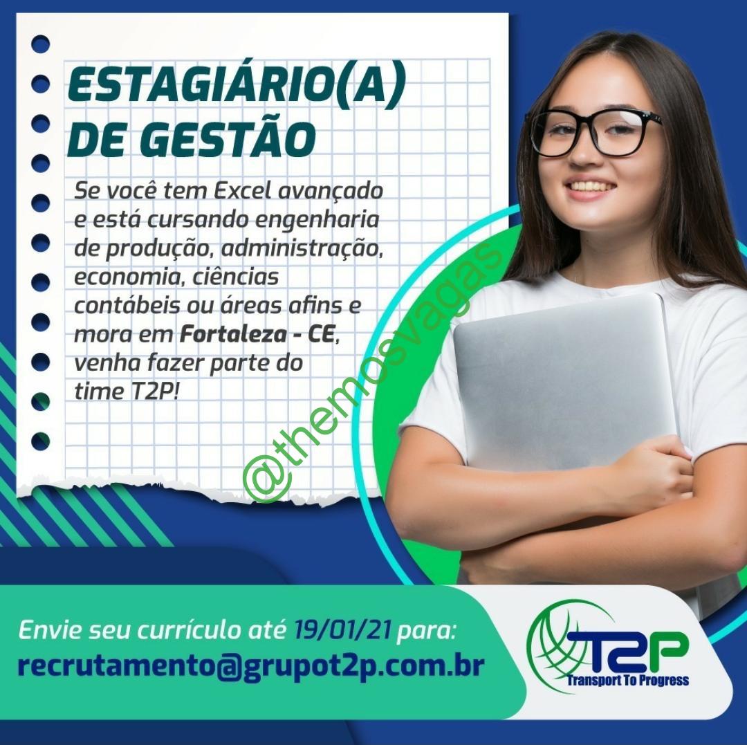 – Interessados(as) e que atendam ao perfil solicitado acima, devem até o dia 19|01|2021 enviar o currículo para o e-mail recrutamento@grupot2p.com.br contendo no título/assunto “Estagiário(a) em Gestão – FOR