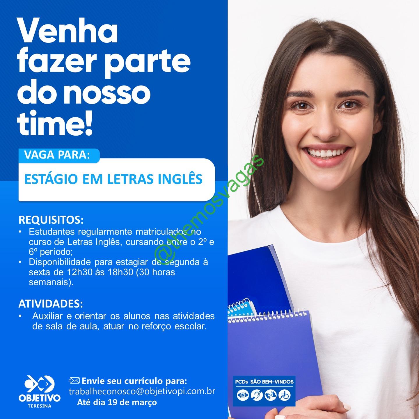 – Interessados(as) e que atendam ao perfil solicitado acima, devem enviar o currículo até 19/03/2023 para o e-mail trabalheconosco@objetivopi.com.br contendo no título/assunto “Estágio em Inglês – THE”.