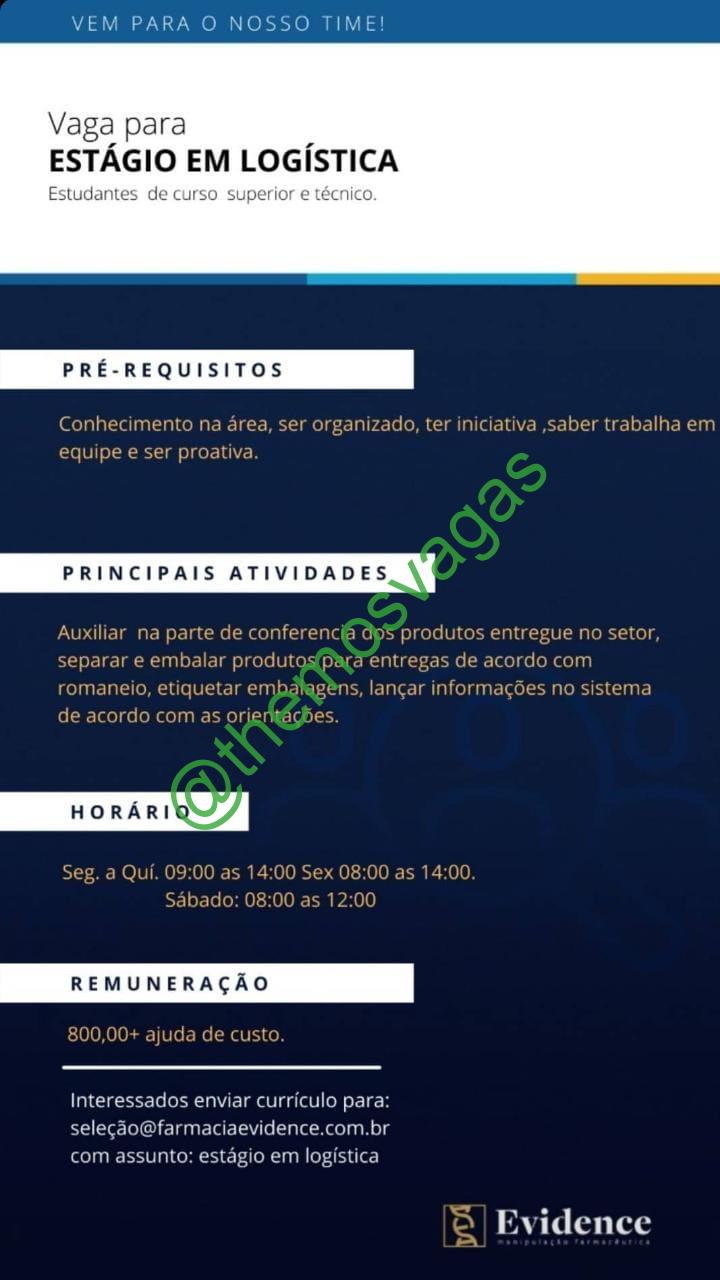 – Interessados(as) e que atendam ao perfil solicitado acima, devem enviar o currículo para o e-mail selecao@farmaciaevidence.com.br, contendo no titulo/assunto “Estágio em Logística – FOR