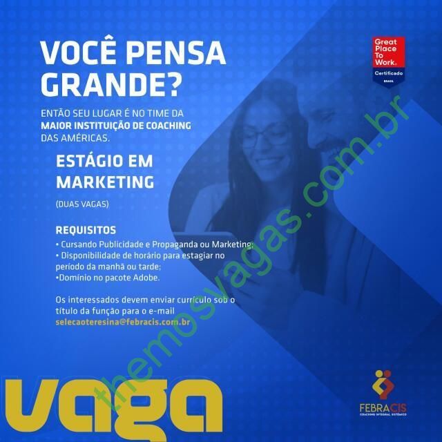 – Interessados(as) e que atendam aos requisitos devem enviar o perfil profissional, colocando no título do e-mail “Estágio em Marketing”, para:  selecaoteresina@febracis.com.br