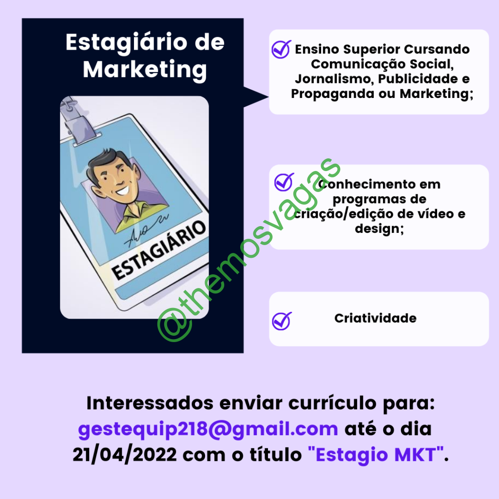 – Interessados(as) e que atendam ao perfil solicitado acima, devem enviar o currículo até 21/04/2022  para o e-mail gestequip218@gmail.com contendo no título/assunto “Estagio MKT