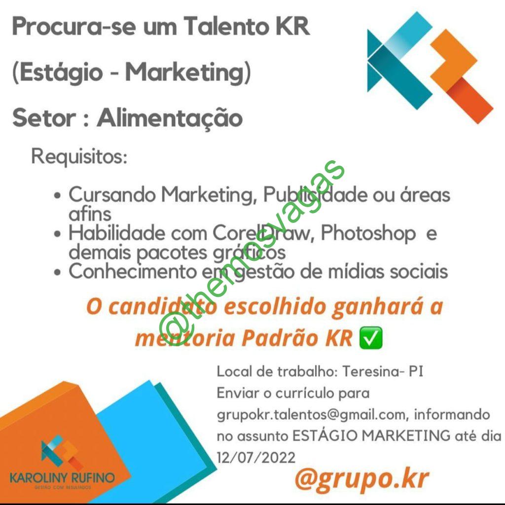 – Interessados(as) e que atendam ao perfil solicitado acima, devem enviar o currículo até 12/07/2022  para o e-mail grupokr.talentos@gmail.com contendo no título/assunto “Estágio Marketing