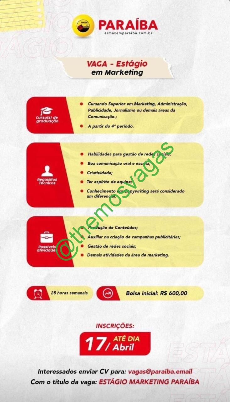 – Interessados(as) e que atendam ao perfil solicitado acima, devem enviar o currículo até 17/04/2023  para o e-mail vagas@paraiba.email contendo no título/assunto “Estágio Marketing Paraíba”.