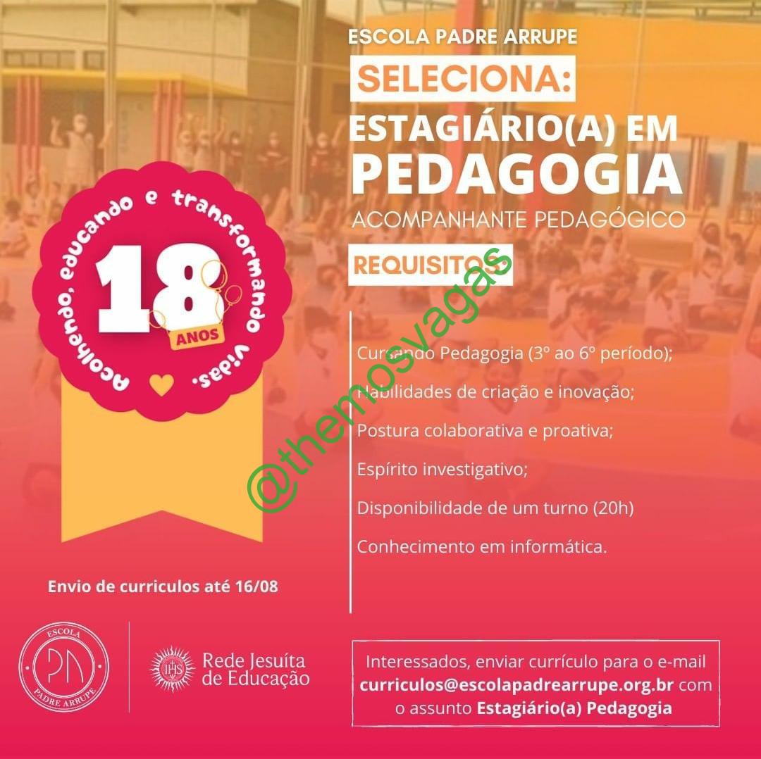– Interessados(as) e que atendam ao perfil solicitado acima, devem enviar o currículo até 16/08/2021 para o e-mail curriculos@escolapadrearrupe.org.br, contendo no título/assunto “Estagiário(a) Pedagogia