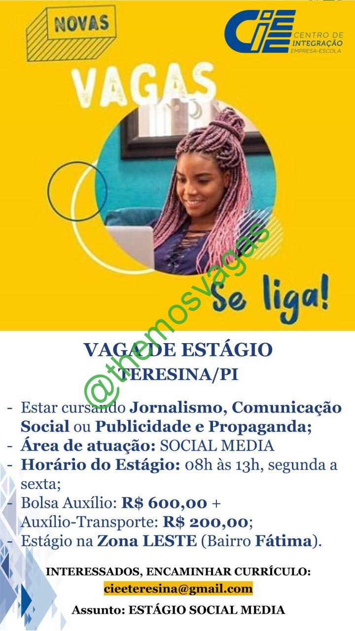– Interessados(as) e que atendam ao perfil solicitado acima, devem enviar o currículo para o e-mail cieeteresina@gmail.com contendo no título/assunto “Estágio Social Media