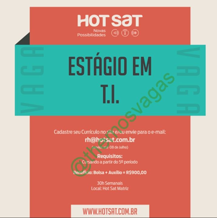– Interessados(as) e que atendam aos requisitos devem enviar o perfil profissional até o dia 08/07/2019, colocando no título do e-mail “Estágio de TI”, para:  rh@hotsat.com.br
