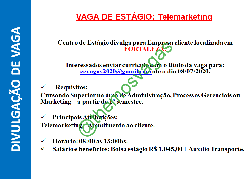 – Interessados(as) e que atendam ao perfil solicitado acima, devem até o dia 08/07/2020 enviar o currículo para o e-mail cevagas2020@gmail.com , colocando no título “Estágio em Telemarketing”.