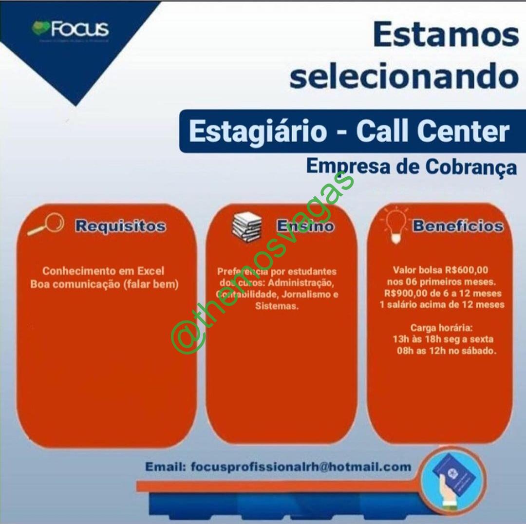 – Interessados(as) e que atendam ao perfil solicitado acima, devem enviar o currículo para o e-mail focusprofissionalrh@hotmail.com contendo no título/assunto “Estágio em Telemarketing THE