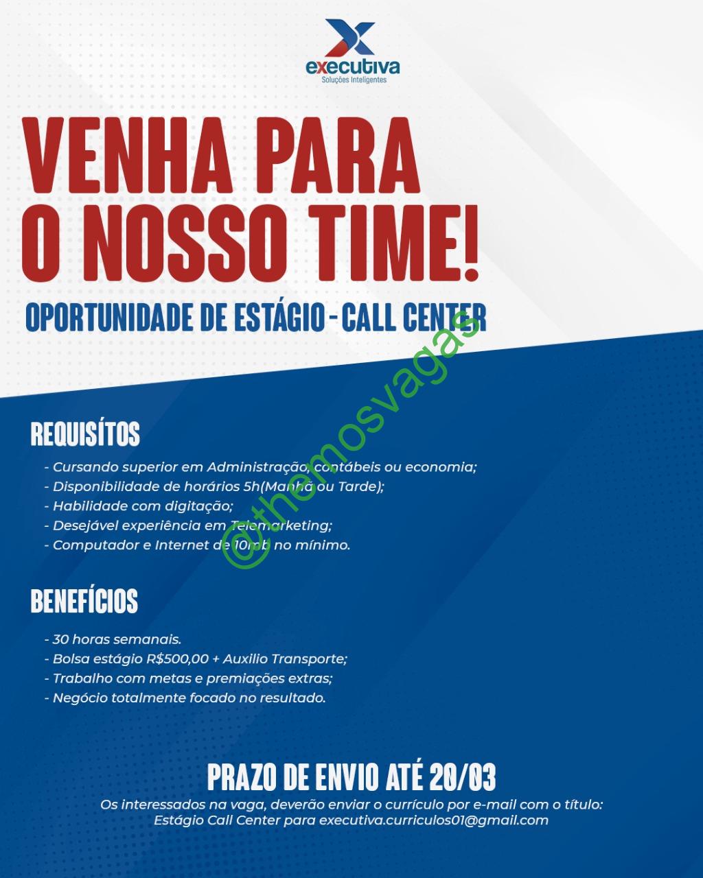 – Interessados(as) e que atendam ao perfil solicitado acima, devem enviar o currículo até 20/03/2021 para o e-mail executiva.curriculos01@gmail.com contendo no título/assunto “Estágio Call Center THE
