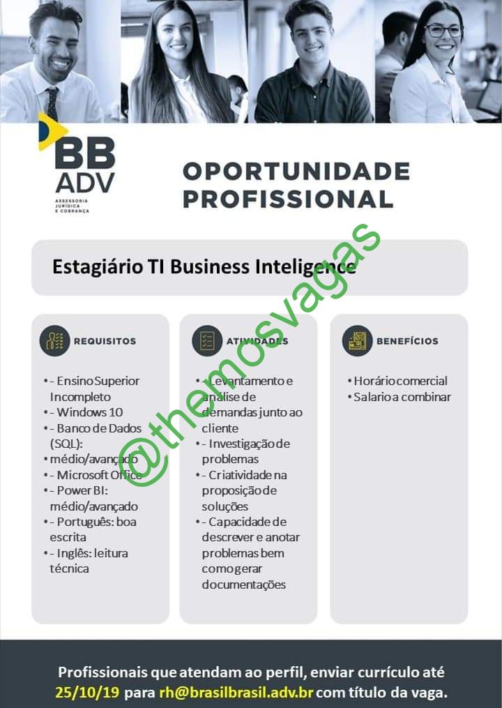 – Interessados(as) e que atendam ao perfil solicitado acima, devem enviar o currículo para o e-mail rh@brasilbrasil.adv.br  até o dia 25/10/2019, colocando no título “Estágio em TI”.