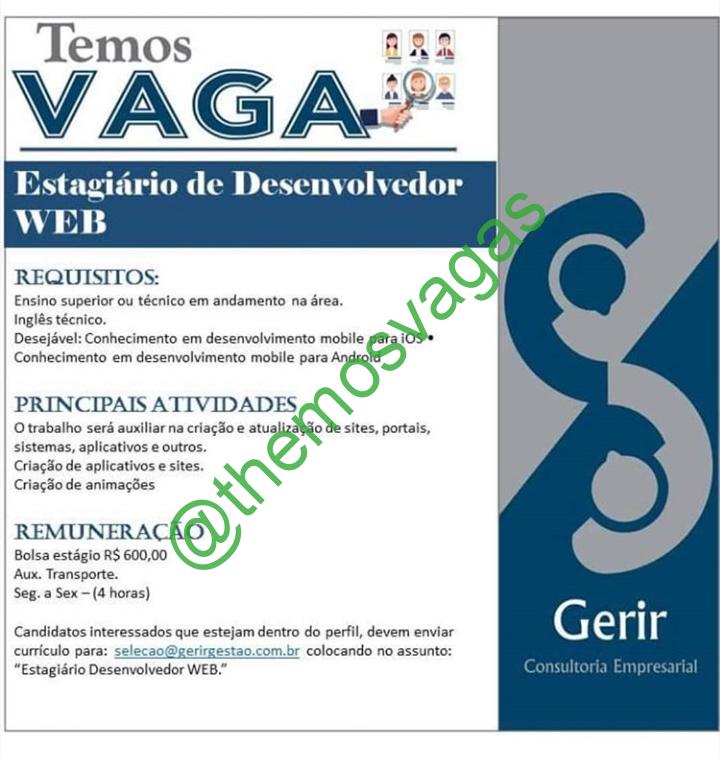 – Interessados(as) e que atendam ao perfil solicitado acima, devem enviar o currículo para o e-mail selecao@gerirgestao.com.br , colocando no título “Estagiário(a) Desenvolvedor WEB”.