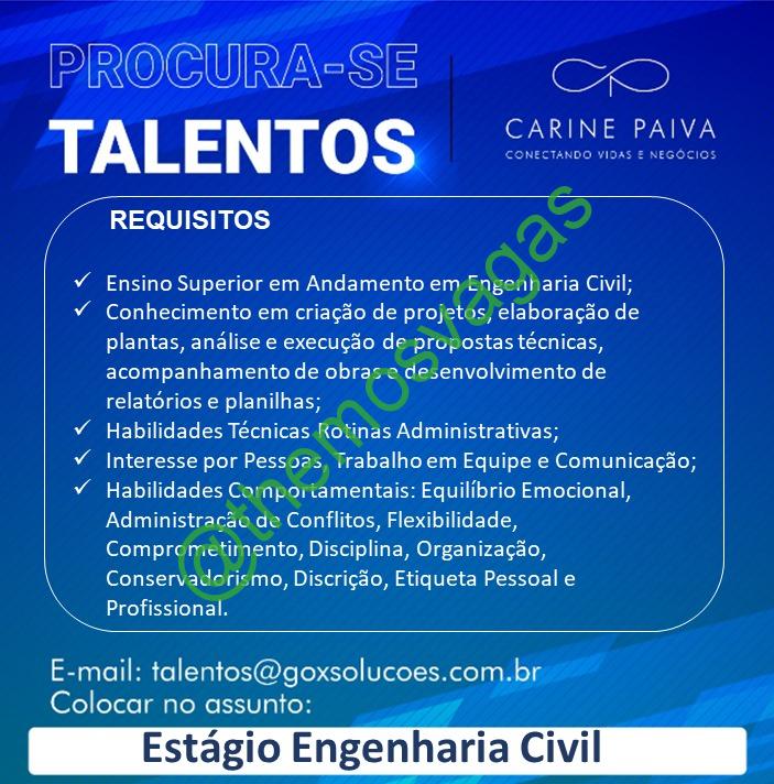 – Interessados(as) e que atendam ao perfil solicitado acima, devem enviar o currículo para o e-mail talentos@goxsolucoes.com.br contendo no título/assunto “Estágio Engenharia Civil THE
