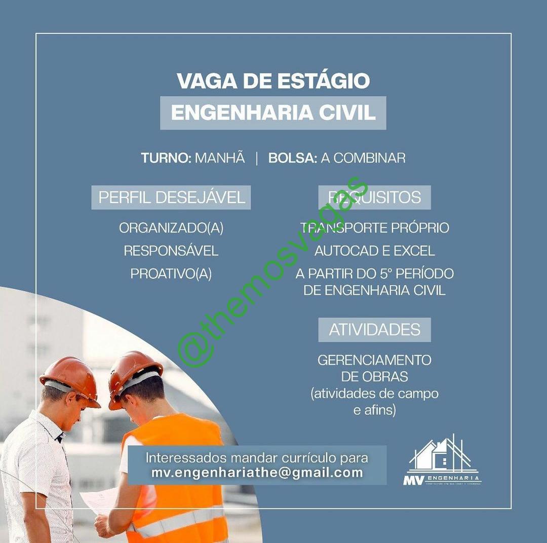 – Interessados(as) e que atendam ao perfil solicitado acima, devem enviar o currículo para o e-mail mv.engenhariathe@gmail.com , contendo no título/assunto “Estágio em Engenharia Civil – THE“.