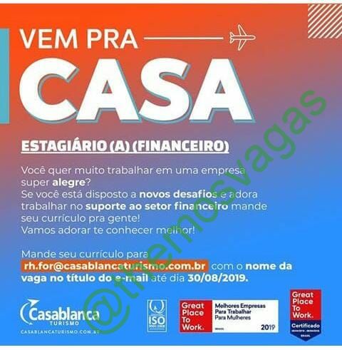 – Interessados(as) e que atendam ao perfil solicitado acima, devem enviar o currículo para o e-mail rh.for@casablancaturismo.com.br até o dia 30/08/2019 , colocando no título “Estágio Financeiro”.
