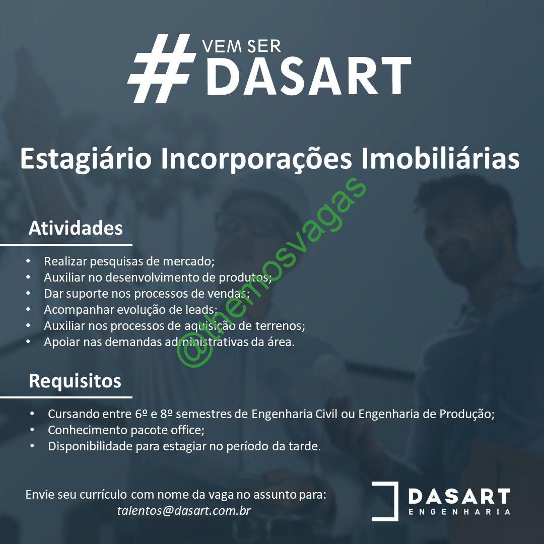 – Interessados(as) e que atendam ao perfil solicitado acima, devem enviar o currículo para o e-mail talentos@dasart.com.br, contendo no título/assunto “Estágio Imobiliário – FOR”.