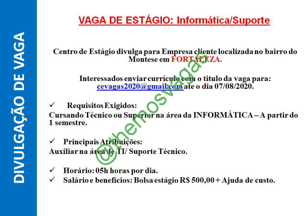 – Interessados e que estejam de acordo com o perfil acima, enviar o currículo para o e-mail cevagas2020@gmail.com com o titulo/assunto “Estagio Informatica/suporte – FOR ”.