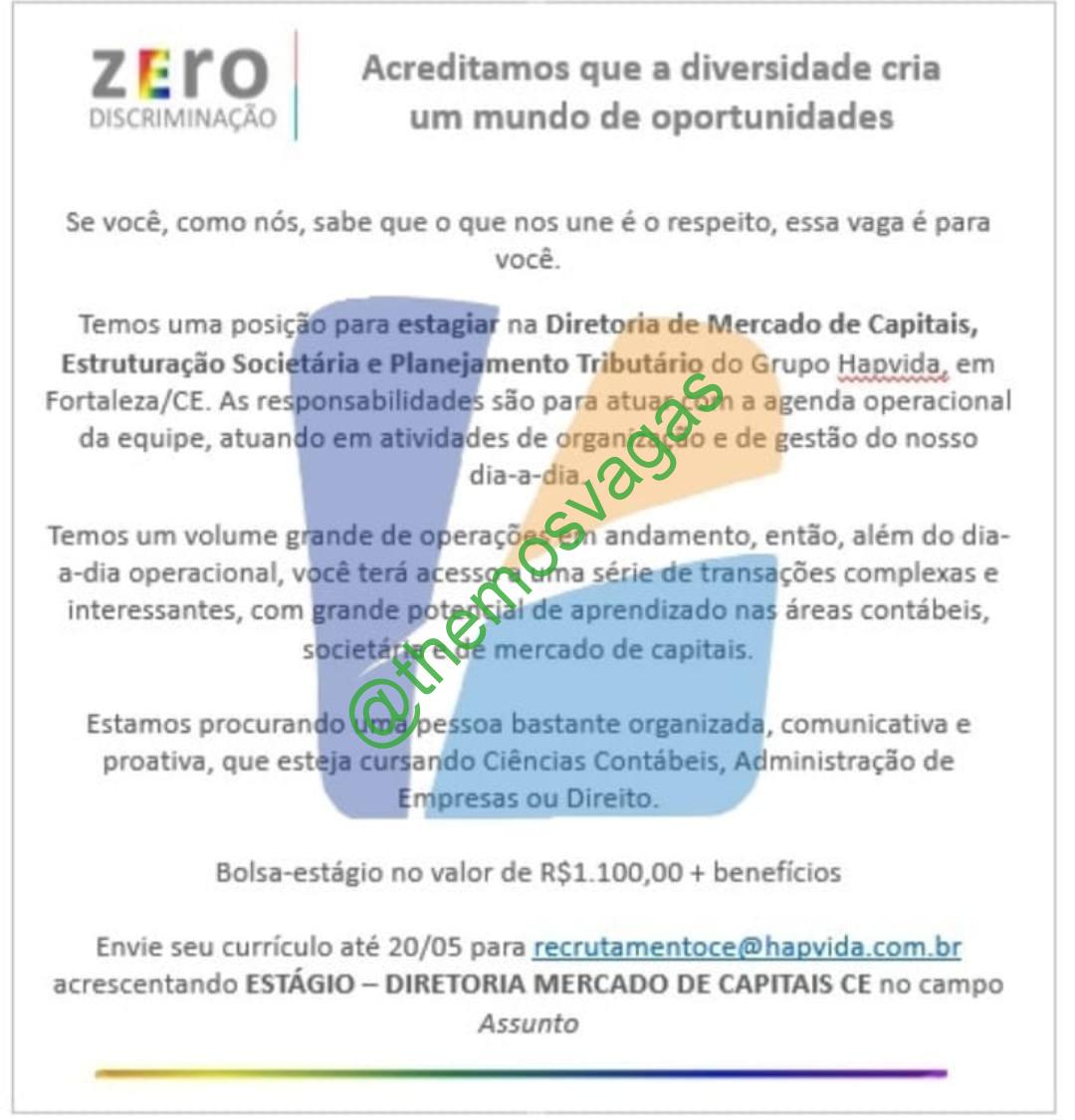 – Interessados(as) e que atendam ao perfil solicitado acima, devem enviar o currículo para o e-mail recrutamentoce@hapvida.com.br, contendo no titulo/assunto “Estágio Mercado Capital – FOR”.
