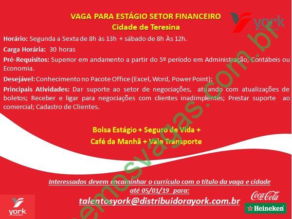Interessados(as) e que atendam aos requisitos exigidos na imagem acima devem enviar o perfil profissional até 05/01/2019, contendo no título/assunto do e-mail “Estágio Setor Financeiro – Teresina”, para talentosyork@distribuidorayork.com.br .