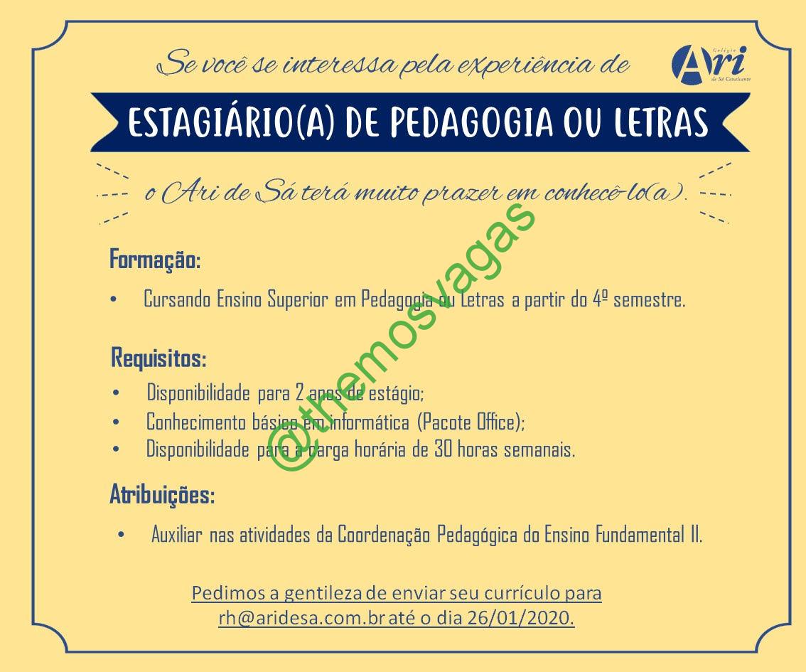 – Interessados(as) e que atendam ao perfil solicitado acima, devem até o dia 26/01/2020 enviar o currículo para o e-mail rh@aridesa.com.br , colocando no título “Estágio de Pedagogia ou Letras”.