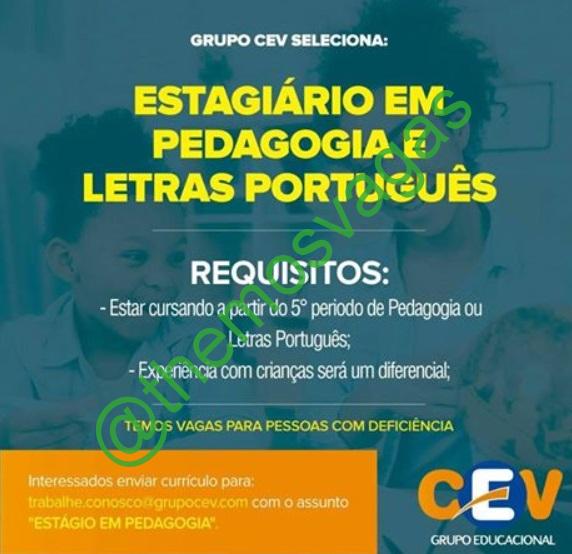 – Interessados(as) e que atendam ao perfil solicitado acima, devem enviar o currículo para o e-mail trabalhe.conosco@grupocev.com contendo no título/assunto “Estágio em Pedagogia“.