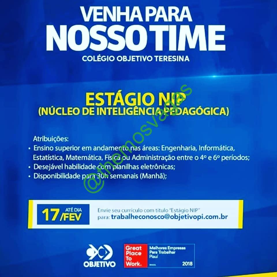 – Interessados(as) e que atendam ao perfil solicitado acima, devem enviar o currículo até 17/02/2020 para o e-mail trabalheconosco@objetivopi.com.br , colocando no título/assunto: “Estágio NIP”.
