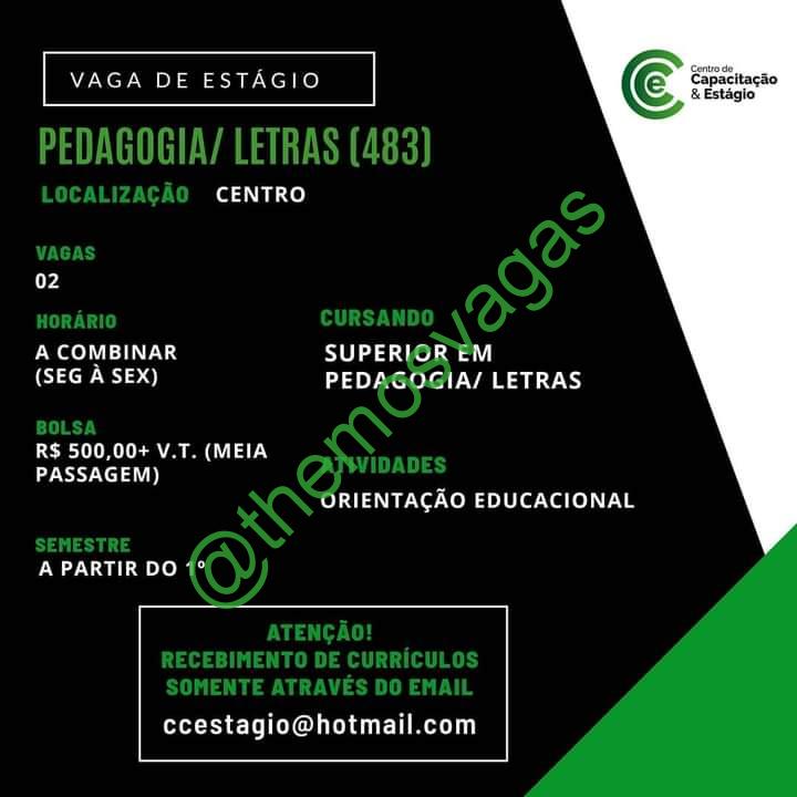 – Interessados(as) e que atendam ao perfil solicitado acima, devem enviar o currículo para o e-mail ccestagio@hotmail.com , colocando no título “Estágio Superior (Pedagogia/Letras)”.