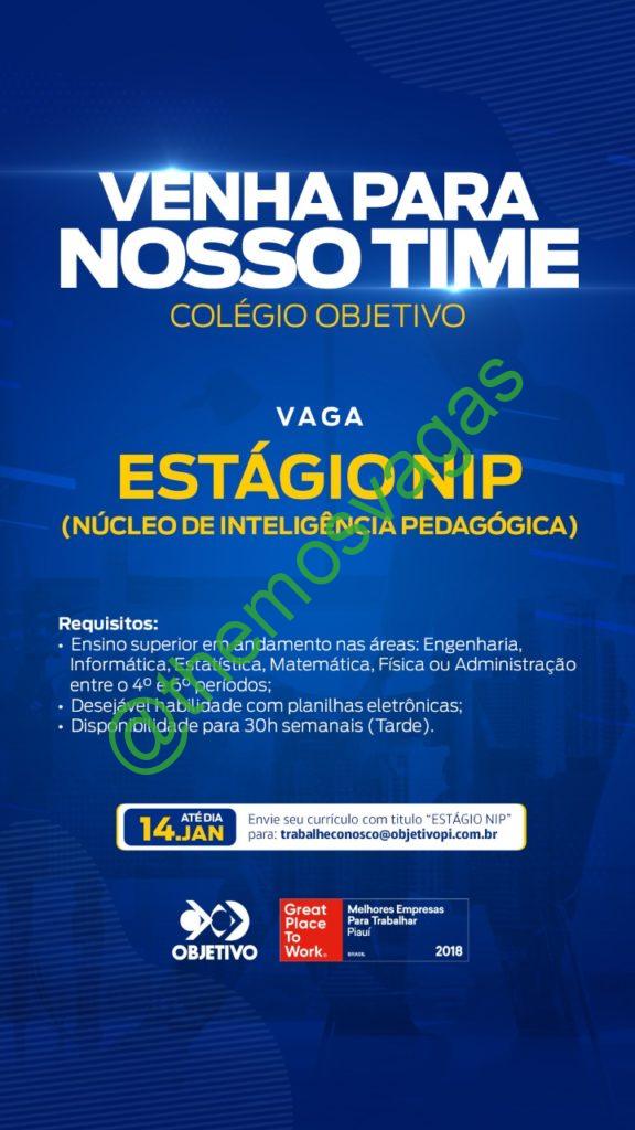 – Interessados(as) e que atendam ao perfil solicitado acima, devem enviar o currículo até 14/01/2021 para o e-mail trabalheconosco@objetivopi.com.br contendo no título/assunto “Estágio NIP.”