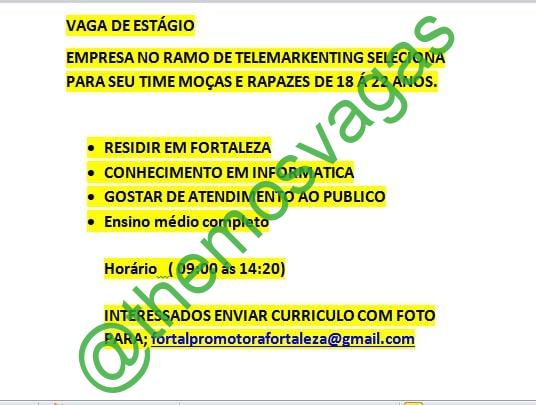 – Interessados(as) e que atendam ao perfil solicitado acima, devem enviar o currículo para o e-mail fortalpromotorafortaleza@gmail.com , contendo no título/assunto “Estágio Telemarketing – FOR“.