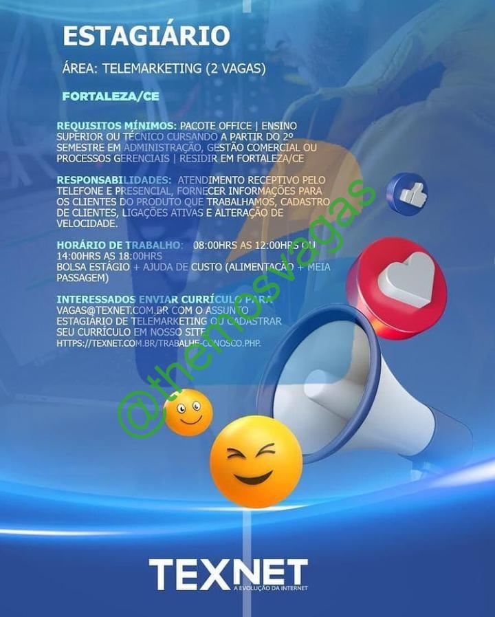 – Interessados(as) e que atendam ao perfil solicitado acima, devem enviar o currículo para o e-mail vagas@texnet.com.br, contendo no título/assunto “Estágio Telemarketing – FOR”.