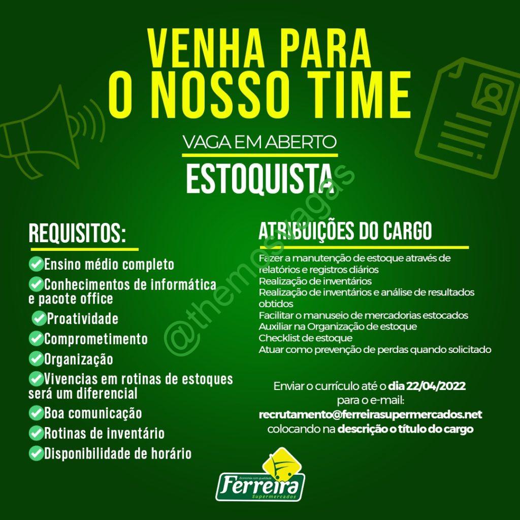 – Interessados(as) e que atendam ao perfil solicitado acima, devem enviar o currículo até 22/04/2022  para o e-mail recrutamento@ferreirasupermercados.net contendo no título/assunto “Estoquista THE