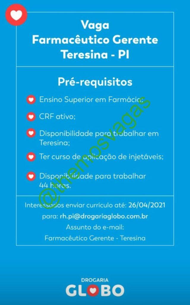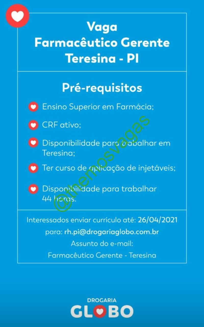 – Interessados(as) e que atendam ao perfil solicitado acima, devem enviar o currículo até 26/04/2021 para o e-mail rh.pi@drogariaglobo.com.br contendo no título/assunto “Farmacêutico Gerente THE