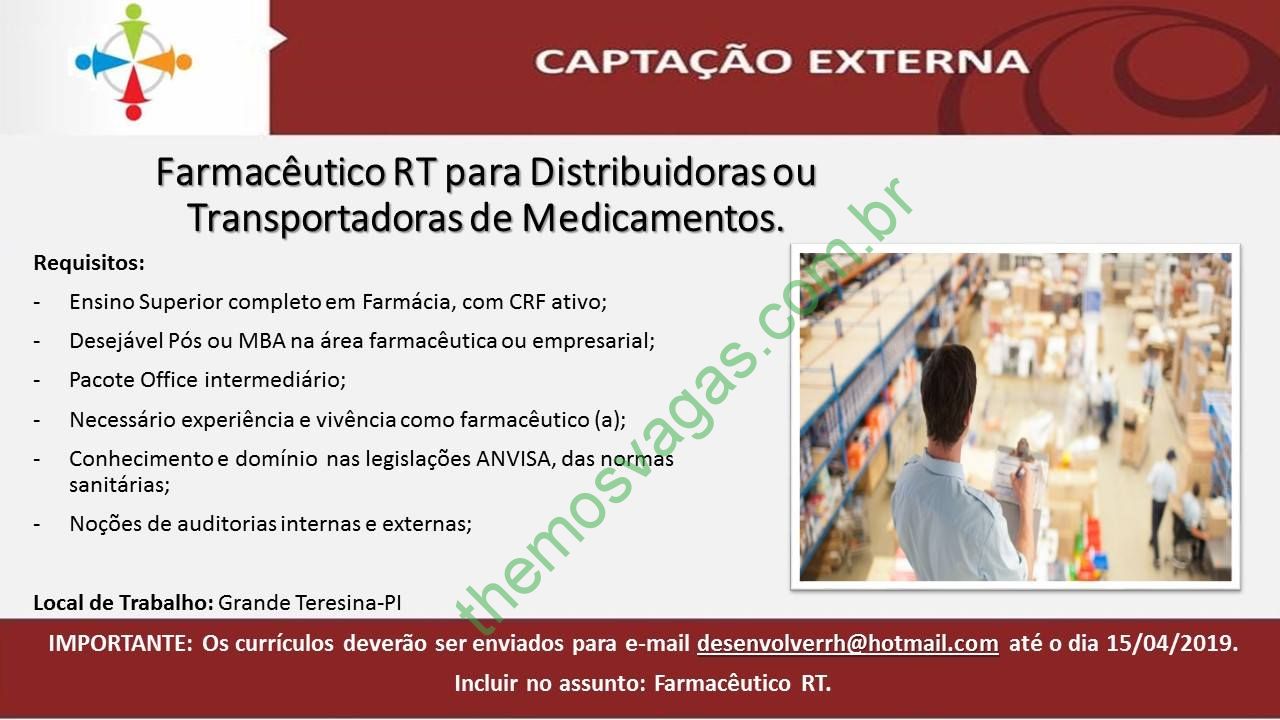 – Interessados(as) e que atendam aos requisitos devem enviar o perfil profissional até o dia 15/04/2019, colocando no título do e-mail “Farmacêutico RT”, para: desenvolverrh@hotmail.com