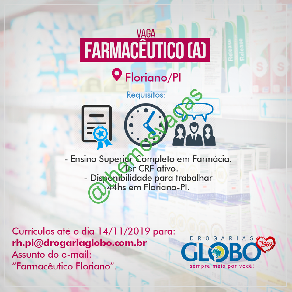 – Interessados(as) e que atendam ao perfil solicitado acima, devem enviar o currículo até o dia 14/11/2019 para o e-mail rh.pi@drogariaglobo.com.br , colocando no título “Farmacêutico(a) Floriano”.