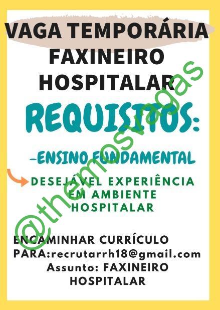 – Interessados(as) e que atendam ao perfil solicitado acima, devem enviar o currículo para o e-mail recrutarrh18@gmail.com , colocando no título/assunto: “Faxineiro(a) Hospitalar THE”.