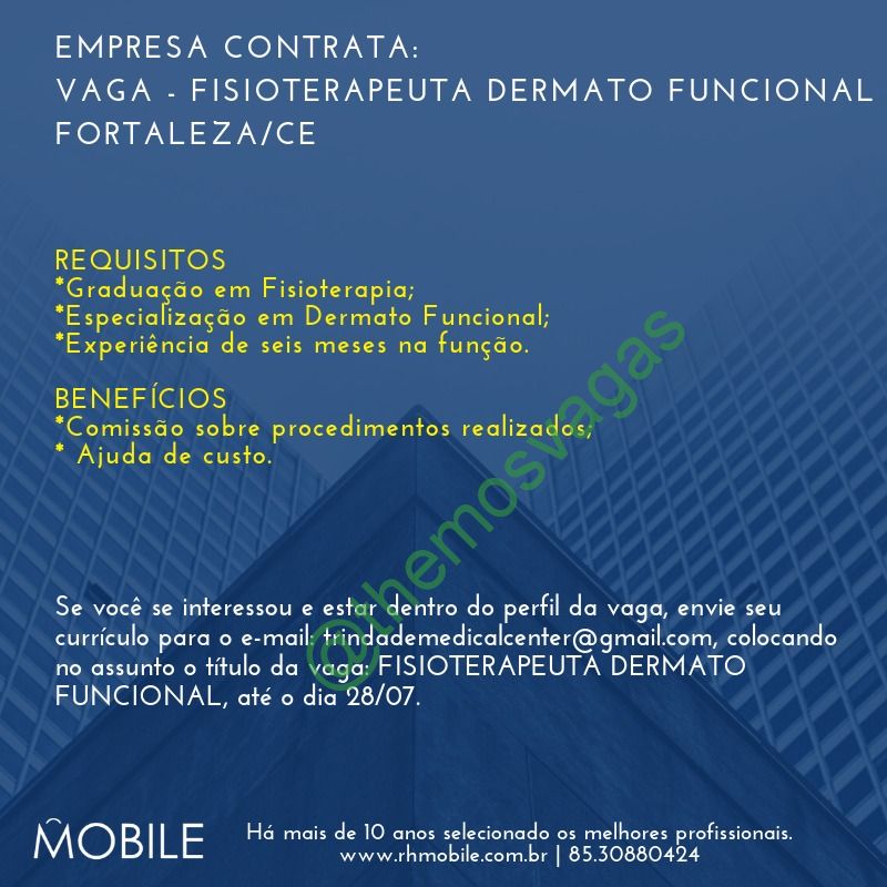 – Interessados(as) e que atendam ao perfil solicitado acima, devem enviar o currículo para o e-mail trindademedicalcenter@gmail.com até o dia 28/07/2019, colocando no título “Fisioterapeuta Dermato Funcional”.