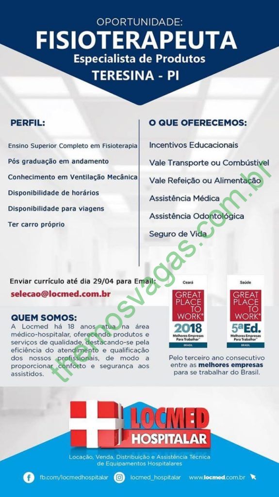 – Interessados(as) e que atendam aos requisitos devem enviar o perfil profissional até o dia 29/04/2019, colocando no título do e-mail “Fisioterapeuta Teresina”, para: selecao@locmed.com.br