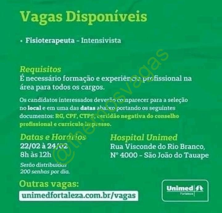 – Interessados(as) e que atendam ao perfil solicitado acima, devem comparecer no endereço Rua Visconde do Rio Branco Nº 4000, São João do Tauape, portando RG, CPF, Certidando negativa do conselho profissional e currículo impresso  ou  cadastrar o currículo no site de cadastro