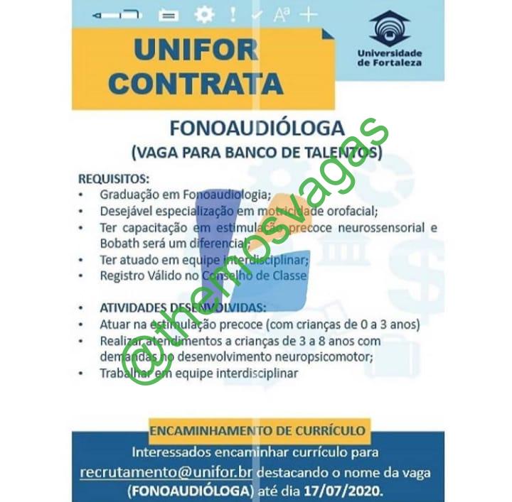 – Interessados(as) e que atendam ao perfil solicitado acima, devem até o dia 17/07/2020 enviar o currículo para o e-mail recrutamento@unifor.br , colocando no título “FONOAUDIÓLOGA”.