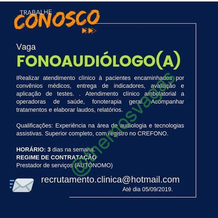 – Interessados(as) e que atendam ao perfil solicitado acima, devem enviar o currículo até 05/09/2019 para o e-mail recrutamento.clinica@hotmail.com contendo no título/assunto “Fonoaudiólogo(a) SLZ”.