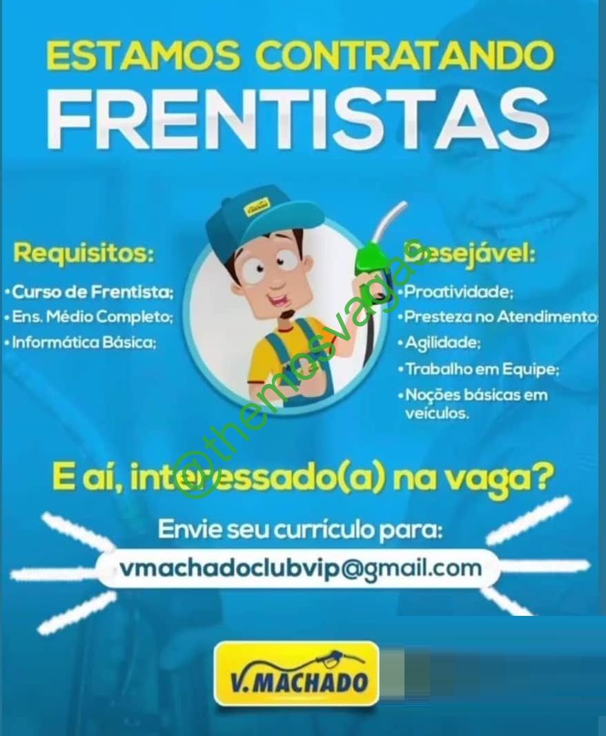 – Interessados(as) e que atendam ao perfil solicitado acima, devem enviar o currículo para o e-mail vmachadoclubvip@gmail.com, contendo no título/assunto “Frentista – THE“.