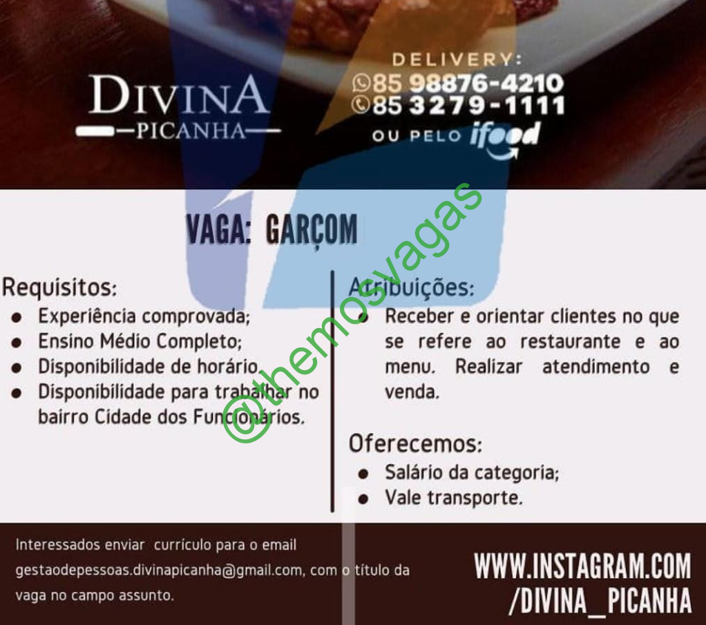 – Interessados(as) e que atendam ao perfil solicitado acima, devem enviar o currículo para o e-mail gestaodepessoas.divinapicanha@gmail.com, contendo no titulo/assunto “Garçom – FOR”
