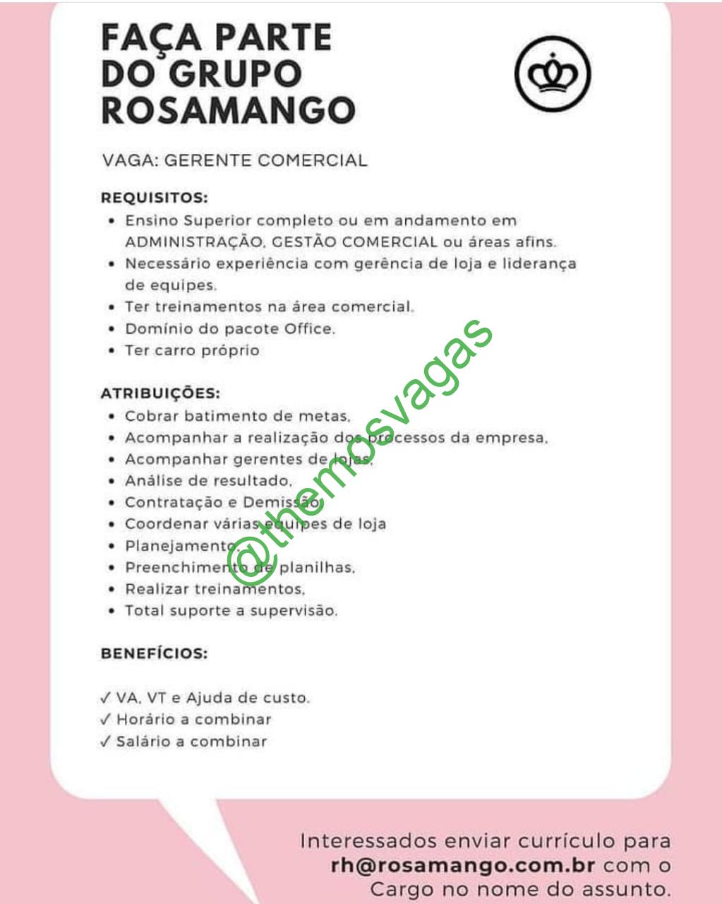 – Interessados(as) e que atendam ao perfil solicitado acima, devem enviar o currículo para o e-mail rh@rosamango.com.br, contendo no titulo/assunto “Gerente Comercial – FOR”