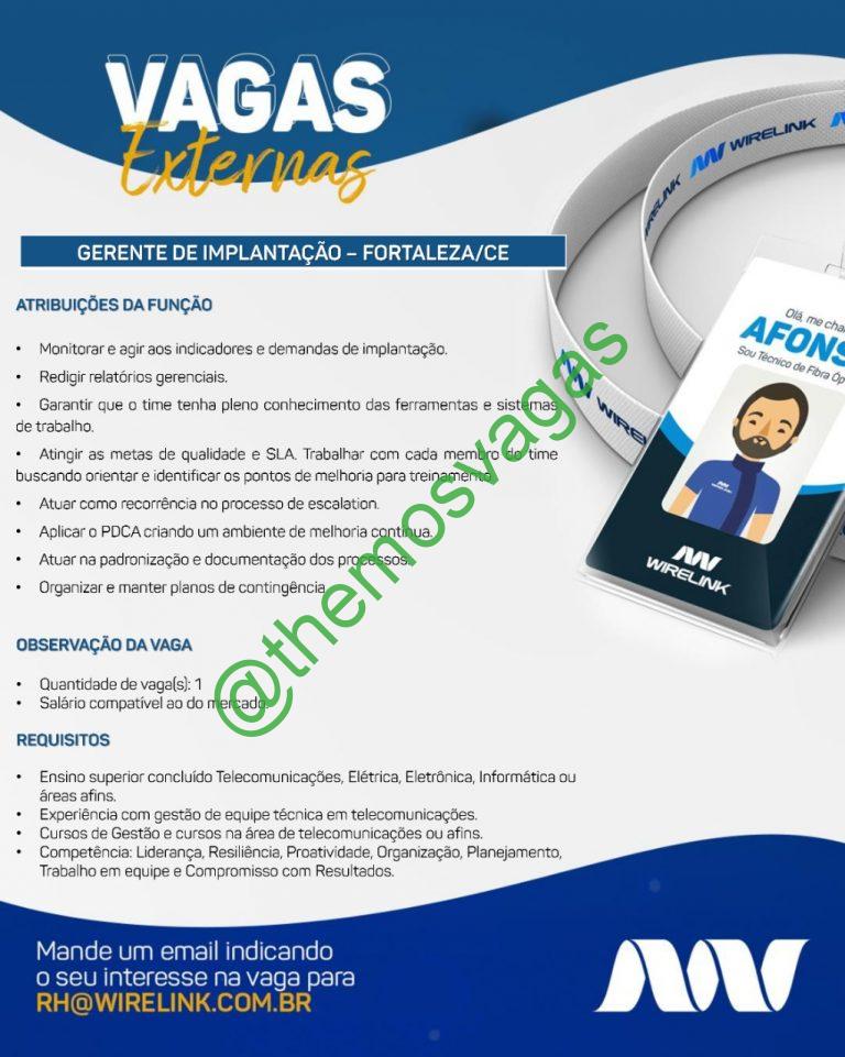 – Interessados(as) e que atendam ao perfil solicitado acima, devem enviar o currículo para o e-mail rh@wirelink.com.br contendo no título/assunto “Gerente de Implantação – FOR“.