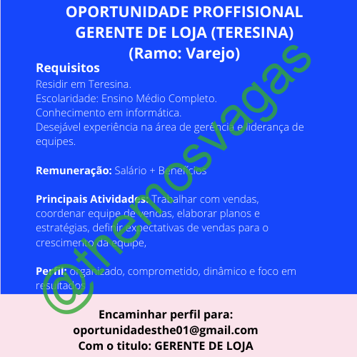 – Interessados(as) e que atendam ao perfil solicitado acima, devem enviar o currículo até 11/01/2020 para o e-mail oportunidadesthe01@gmail.com contendo no título/assunto “Gerente de Loja