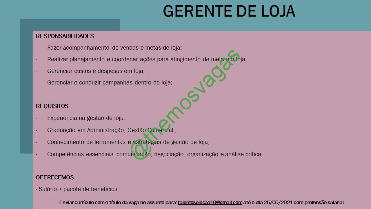 –  Interessados(as) e que atendam ao perfil solicitado acima, devem enviar o currículo até 25/05/2021 para o e-mail talentosselecao10@gmail.com, contendo no título/assunto “Gerente de Loja – FOR
