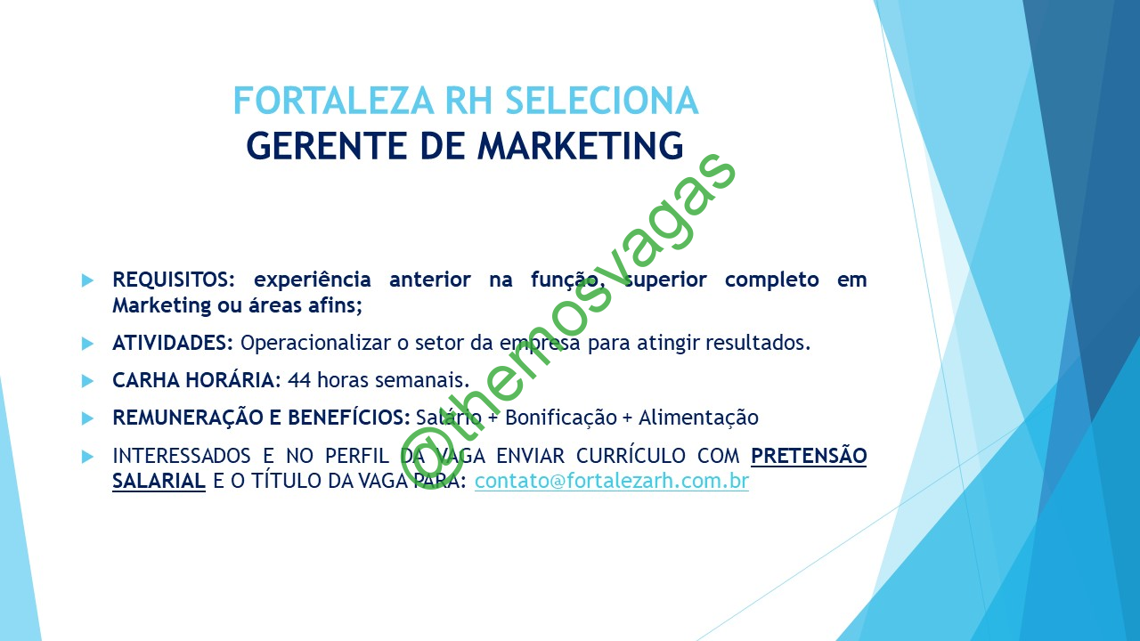 – Interessados(as) e que atendam ao perfil solicitado acima, devem enviar o currículo com pretensão salarial para o e-mail contato@fortalezarh.com.br , colocando no título “Gerente de Marketing”.