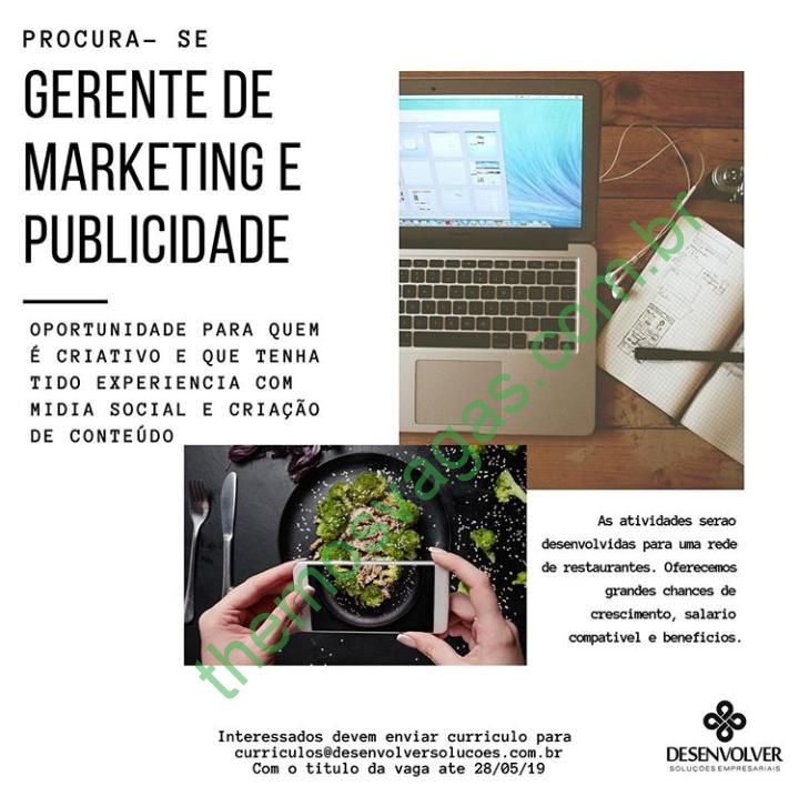 – Interessados(as) e que atendam aos requisitos devem enviar o perfil profissional até o dia 28/05/2019, colocando no título do e-mail “Gerente de Marketing”, para: curriculos@desenvolversolucoes.com.br